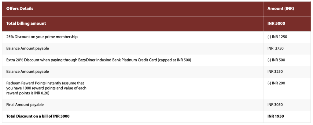 - This discount is applicable through the IndusInd Bank EazyDiner Platinum Card only on paying on the EazyDiner App online via PayEazy.