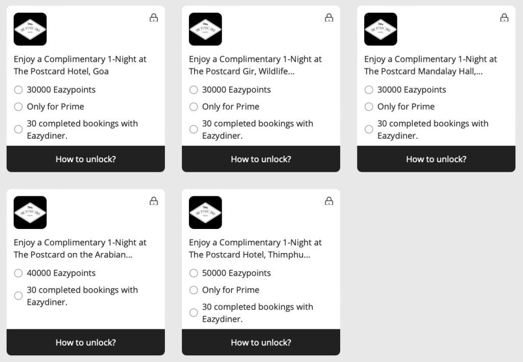 Further if luxury is your cup of tea, then Postcard Hotel (India/ Sri Lanka/ Bhutan) redemption option is also there, starting from 20K EazyDiner points. But there is a condition of paying the full amount for the first night and then the second night becomes complimentary.